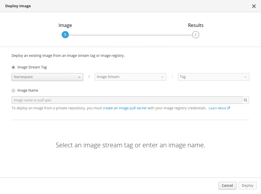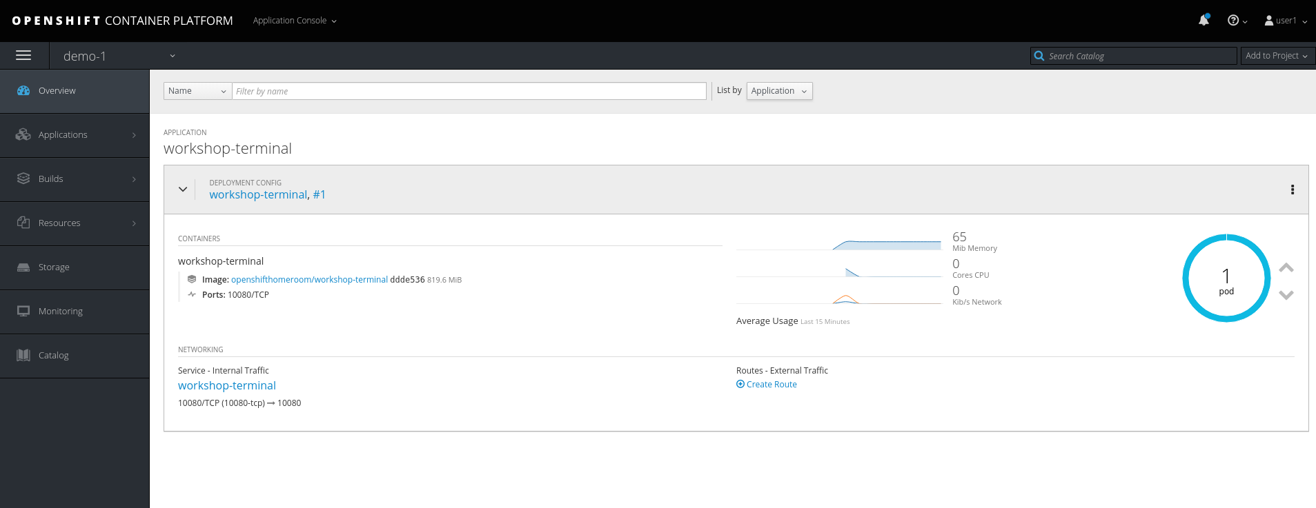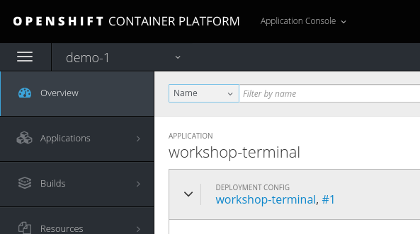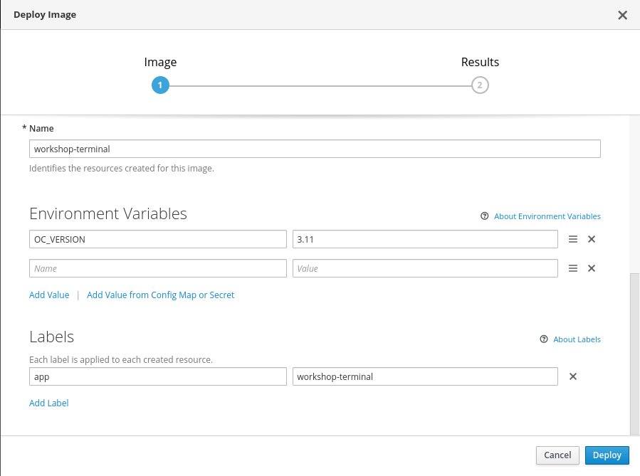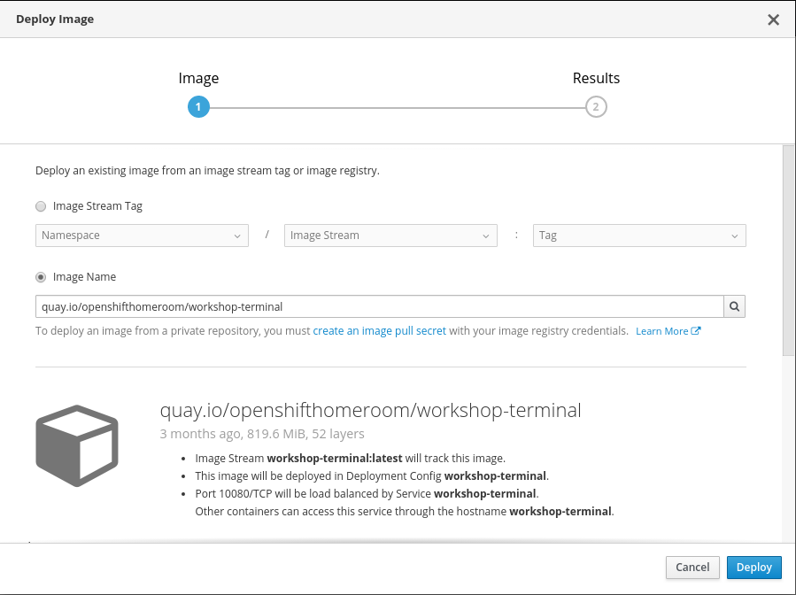 Select the option for "Image Name" and enter "quay.io/openshifthomeroom/workshop-terminal", then click the magnifying glass to the far right to search for the image.